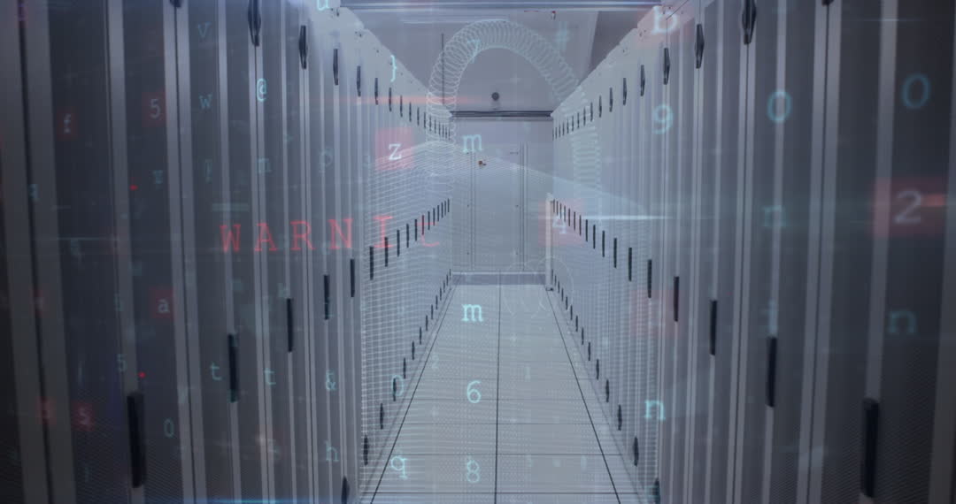 Animation depicting a cyber attack warning overlaid on an infrastructure of a high-security server room. Visualizes digital threats and vulnerabilities in modern data storage facilities. Helpful for articles and presentations about cybersecurity, information technology, digital safety, and network protection.