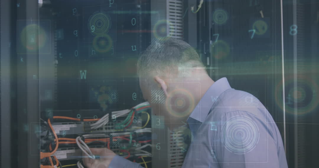 Visual merges digital data interface with technician working on network cables in server room. Perfect for illustrating cyber security concepts, data protection measures, and technological advancements. Useful in contexts relating to global connectivity challenges and IT professional roles in safeguarding information systems.