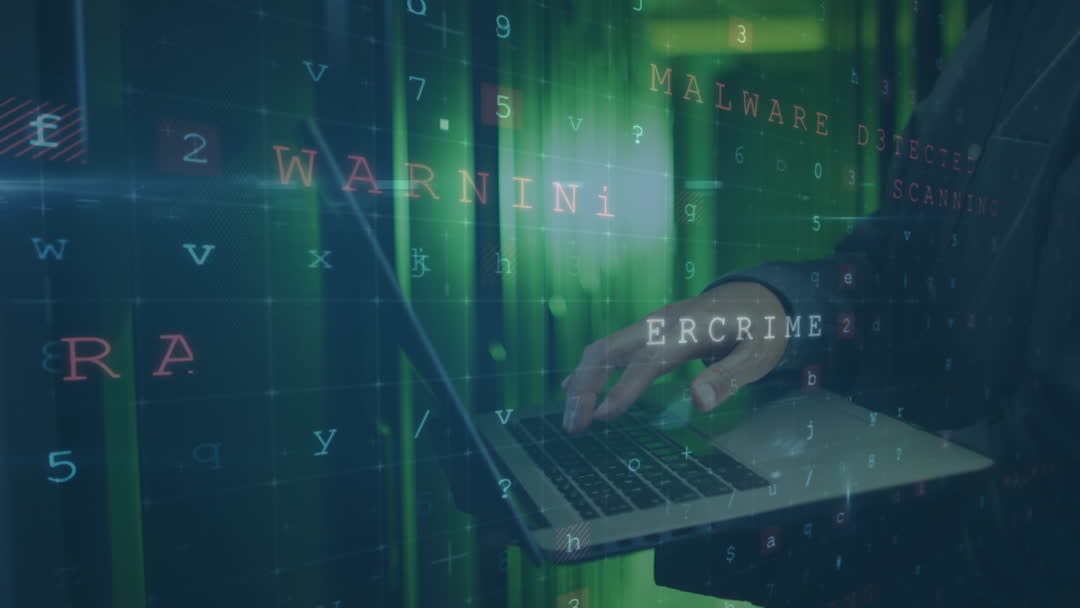 Animation showing cyber attack warning with a hacker using laptop in technological environment. Texts like 'malware', and 'ecrime' convey cybersecurity risks. Useful for illustrating articles or content on cybersecurity threats, data breaches, antivirus solutions, and protection of digital infrastructure.