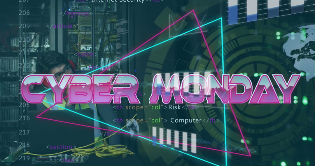 Animation depicting Cyber Monday theme with an engineer working in a server room and data processing elements signifies the modern technological world of e-commerce. Ideal for promotions related to legal sales events, online security services, tech-based companies, and software solutions depicting technological expertise and network infrastructure.