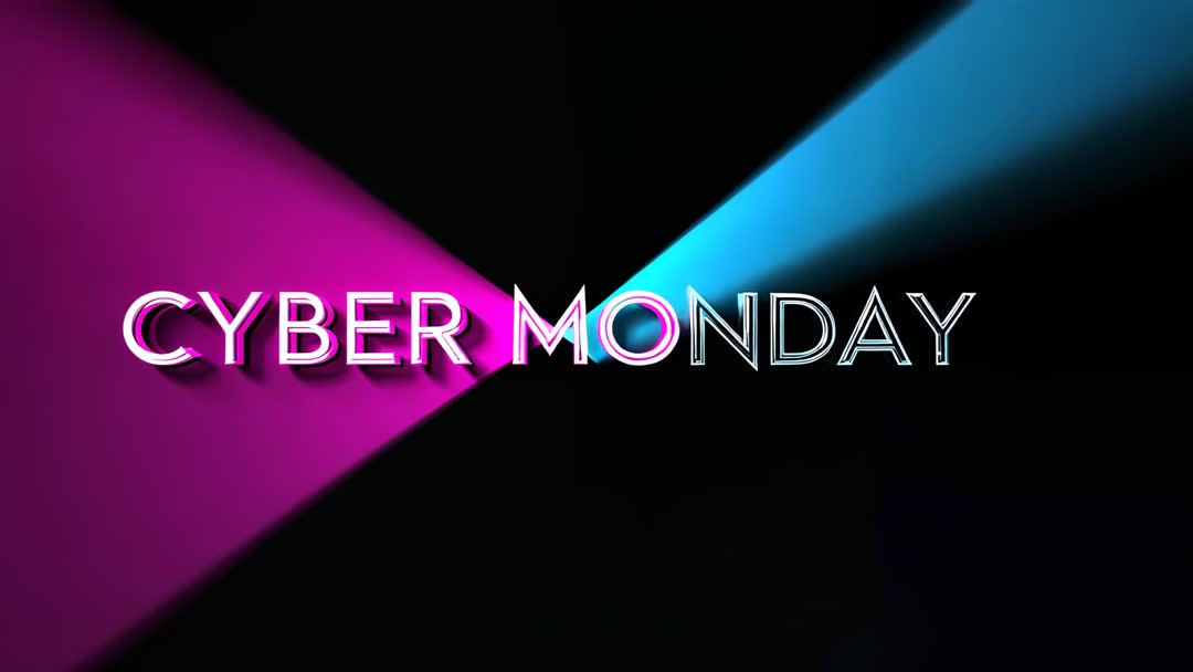 - Cyber Monday neon headline being lit by magenta and cyan spotlights on dark stage