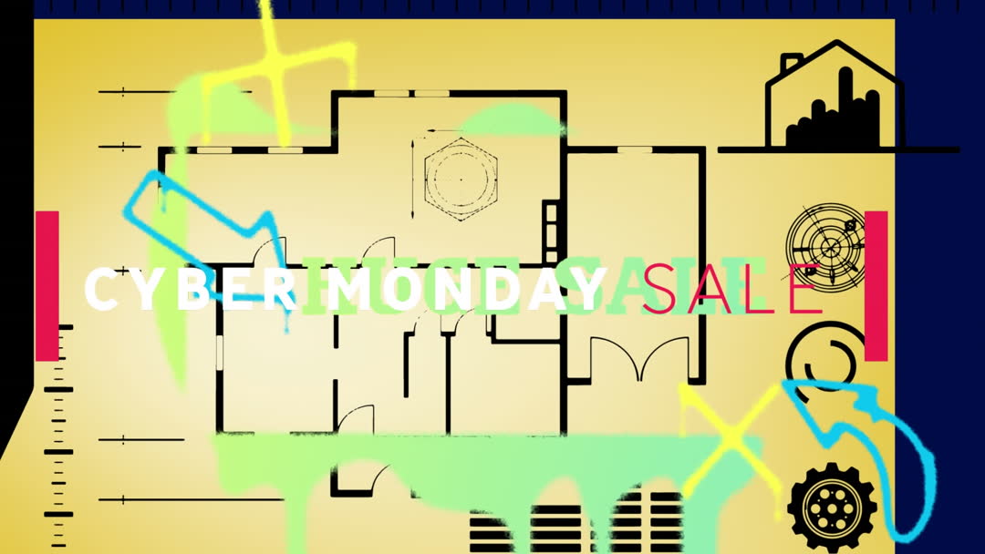 Animation visual with vibrant typography displaying a Cyber Monday sale over a house plan. Ideal for real estate promotions, online sales marketing, digital advertising campaigns, and engaging business presentations highlighting special deals.
