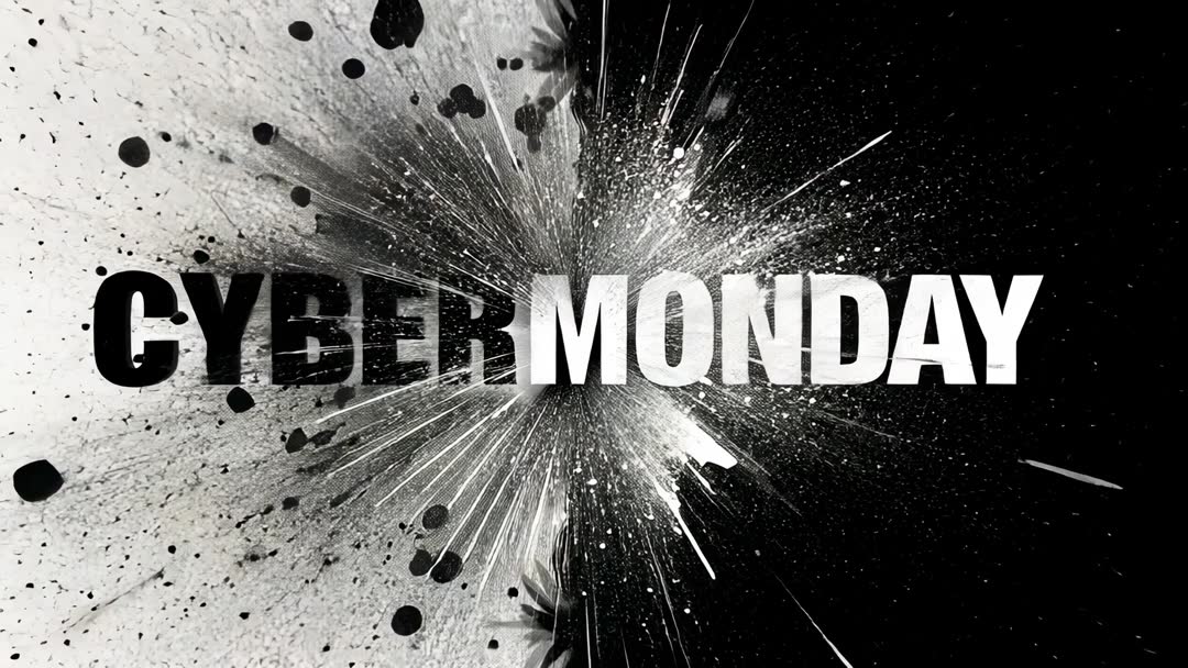 AI Generated Image. Looping 4K video clip showing Cyber Monday headline splitting across monochrome background with central spark sending paint-like splatter and radial streaks. Bold condensed sans-serif type animating with particle burst, motion blur, and high-contrast tonal split. Perfect for online sale campaigns, social media ads, website hero banners, email headers, TV spots, and in-store displays. Editable elements suggested: replace headline text, adjust color accent, overlay logo, add discount tag, extend loop for longer spots. Delivering cinematic energy and gritty splatter texture, making strong visual impact for last-minute promotions, flash sales, and holiday push. File-ready for edit in Premiere, After Effects, or other NLE, allowing quick export for web, broadcast, and mobile channels. Recommended loop length 6-12 seconds.