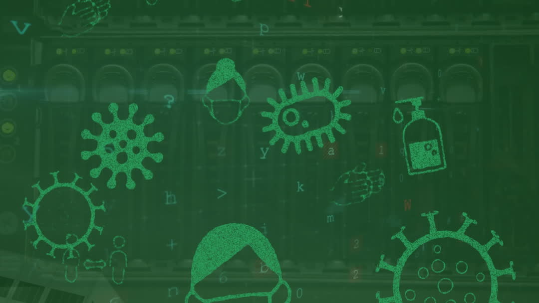 Cyber Security Animated Overlay with Virus Symbols on Server Technology Video