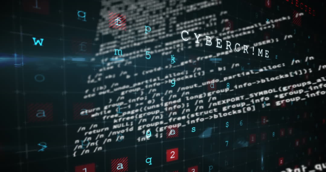 Dynamic depiction of cybersecurity with cascading codes and a focus on cybercrime text brings emphasis to digital safety themes. This is ideal for illustrating concepts related to internet protection, cyber programming, and technology.