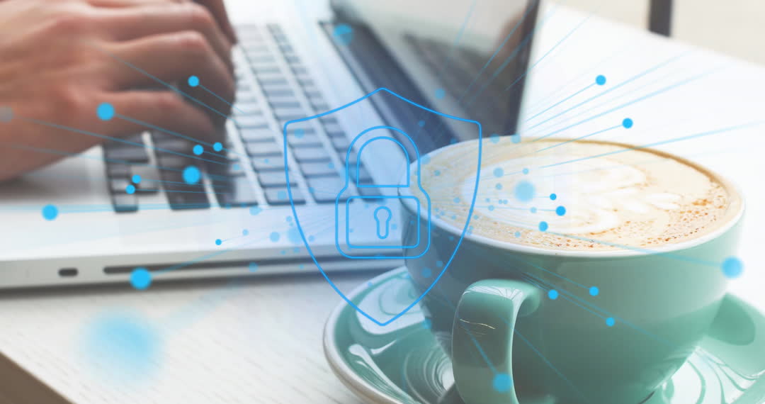 Image illustrates cybersecurity by showing a person using a laptop in a cafe with a digital padlock overlay. Useful for articles or presentations focused on data protection in public spaces or online security measures. Highlights everyday technology use related to cybersecurity.