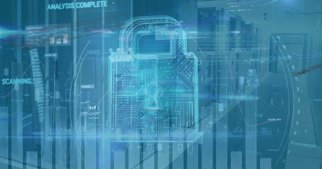 This visual represents the concept of cyber security within a modern server room environment. Digital padlock icon and various data processing holograms emphasize secure data protection and advanced technology in a business information environment. Ideal for use in promoting secure IT solutions, illustrating firewall services, or enhancing security consulting presentations.