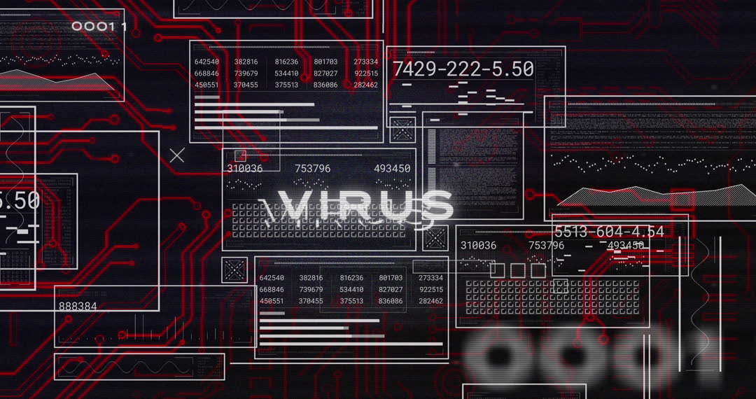 Complex digital graphical interfaces with highlighted word 'VIRUS' portray potential cybersecurity threats. Useful for illustrating themes in data protection, hacking prevention, cyber defense strategies, tech security updates, and informational seminars on maintaining secure networks and systems.