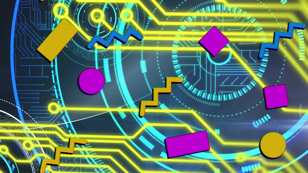 Animation showing vibrant geometric symbols with a graduation cap amidst digital circuit patterns, ideal for representing high-tech education, futuristic learning environments, or virtual graduation ceremonies. Can be used for educational websites, tech-focused presentations, or promotional materials emphasizing innovation.