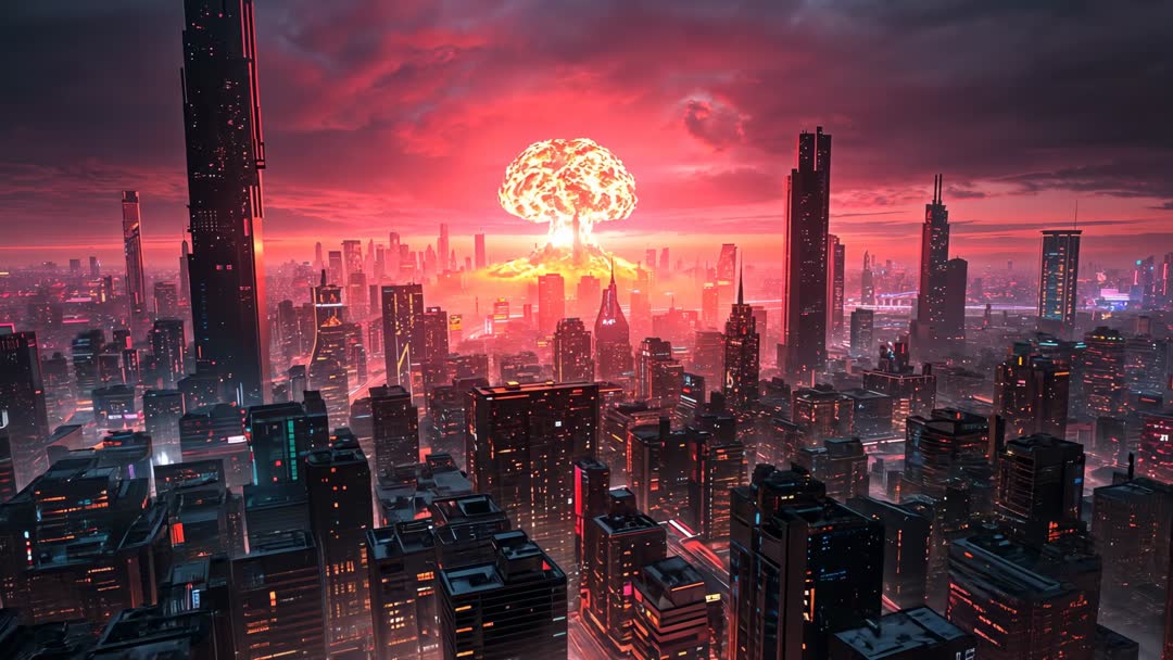 AI Generated Image. This video captures a dramatic futuristic city with a mushroom cloud dominating the skyline. Neon lights glisten below with tall skyscrapers punctuating the bustling metropolis. Perfect for conveying chaos, dystopian futures, or dramatic urban science fiction settings in trailers, gaming promos or AP drama shorts.