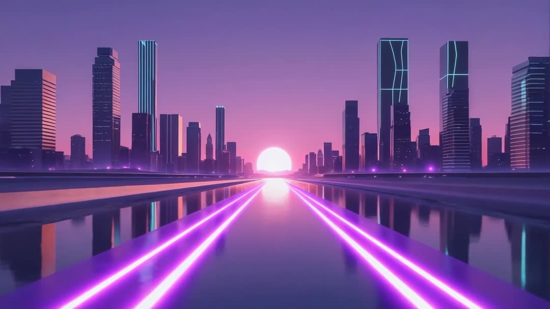 AI Generated Video. This visually captivating scene depicts a futuristic cityscape at sunset, characterized by neon lights and towering buildings. The magenta pathway across the water leading to the reflective structures enhances the sense of a high-tech, cyberpunk aesthetic. Ideal for use in creative projects, sci-fi themes, tech articles, or as a vibrant backdrop in multimedia presentations.