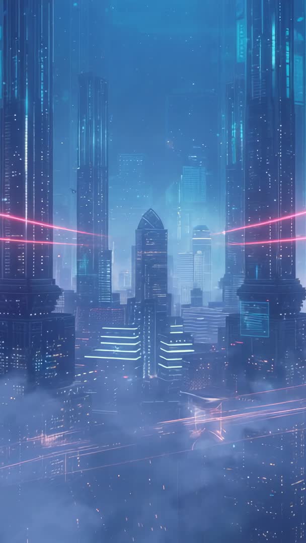 AI Generated Image. Vertical cityscape video showcasing neon-pink beam pulsing between towering skyscrapers while fog drifting through illuminated streets. Mood combining cyberpunk aesthetic with high-tech ambiance, featuring cool blue palette and contrasting neon accents. Ideal for mobile backgrounds, social media Stories and Reels, app intros, technology product launches, cinematic trailers, game trailers, virtual sets, corporate presentations. Suggestions for use: apply subtle camera pan and parallax to enhance depth, add low-frequency ambient sound and synth pad to amplify atmosphere, use loopable edits for continuous display, overlay user interface elements or text in upper and lower safe areas for vertical format. Color grading options: boost cyan tones, increase neon saturation, add grain for retro-futuristic feel. Licensing tip: suitable for futuristic campaigns, concept art showcases, visual identity for tech brands.
