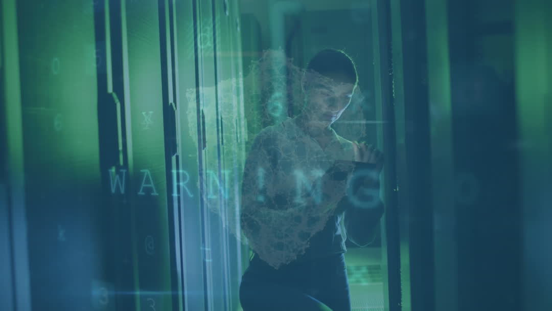 The video features a cybersecurity analyst assessing data in a server room with digital overlays hinting at complex data processes. The use of keywords like 'Warning' suggests a focus on internet security and potential data threats. This visual can be useful for promoting security software, informative blogs on IT security, or advertising technology training programs highlighting modern and secure data management approaches.