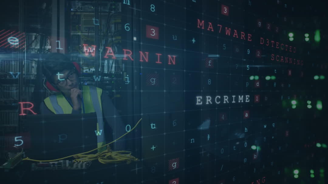 An IT professional, equipped in safety gear, monitors data streams on his laptop next to server racks. Various text alerts like 'WARNING' and 'MALWARE DETECTED' hover, suggesting threats being analyzed in real-time. This visual emphasizes vigilant cybersecurity procedures and online threat monitoring and can be used for content on digital security, IT operations, or global network protection initiatives.