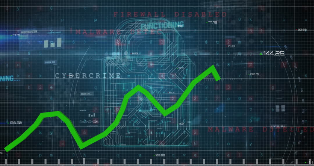 Patchy blue-black digital interface shows cybersecurity elements like digital padlock graphical representation. Green graph line illustrates data fluctuations, touching on online security and digital processing themes. Ideal for demonstrating technology, computer network monitoring solutions, depicting malware defenses, and delivering online protection perspectives in digital presentations.