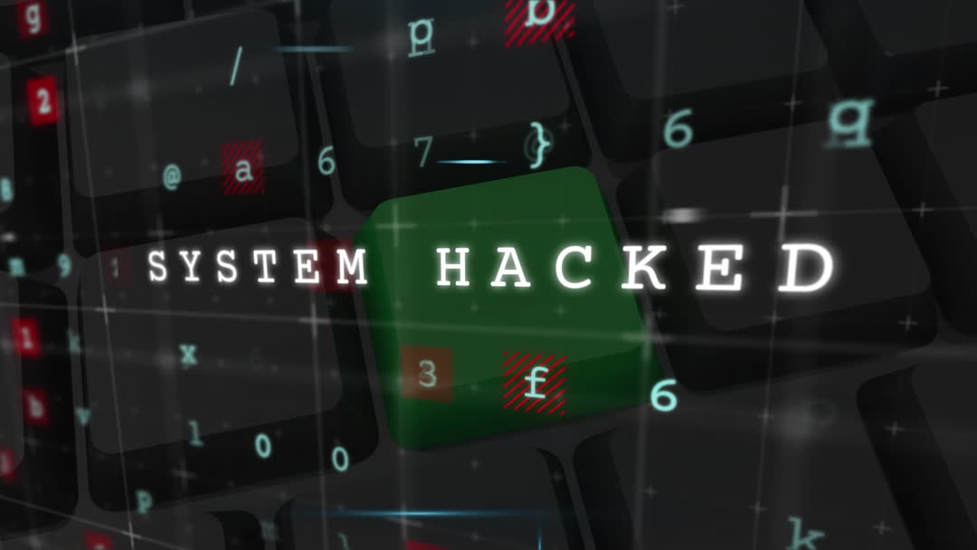 Bold words 'SYSTEM HACKED' stand out amidst keyboard background, symbolizing a digital security infiltration. Ideal for illustrating articles or presentations about cyber risks, online hacking threats, or data breach consequences.