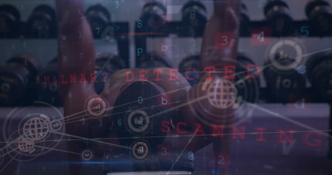 Image combines elements of digital security with a fitness setting, showing a person lifting dumbbells at a gym overlaid with digital security symbols and 'malware detected' alerts. Useful for promoting cybersecurity awareness in technology-enhanced fitness environments.