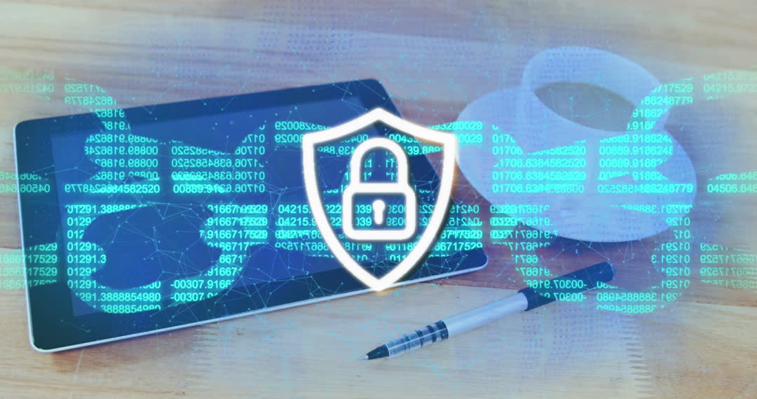 Illustrates concept of cybersecurity with a digital interactive lock overlay on a tablet in a workspace setting. Perfect for use in IT security blogs, data protection materials, or technology presentations, conveying messages about securing electronic information and safe computer practices.