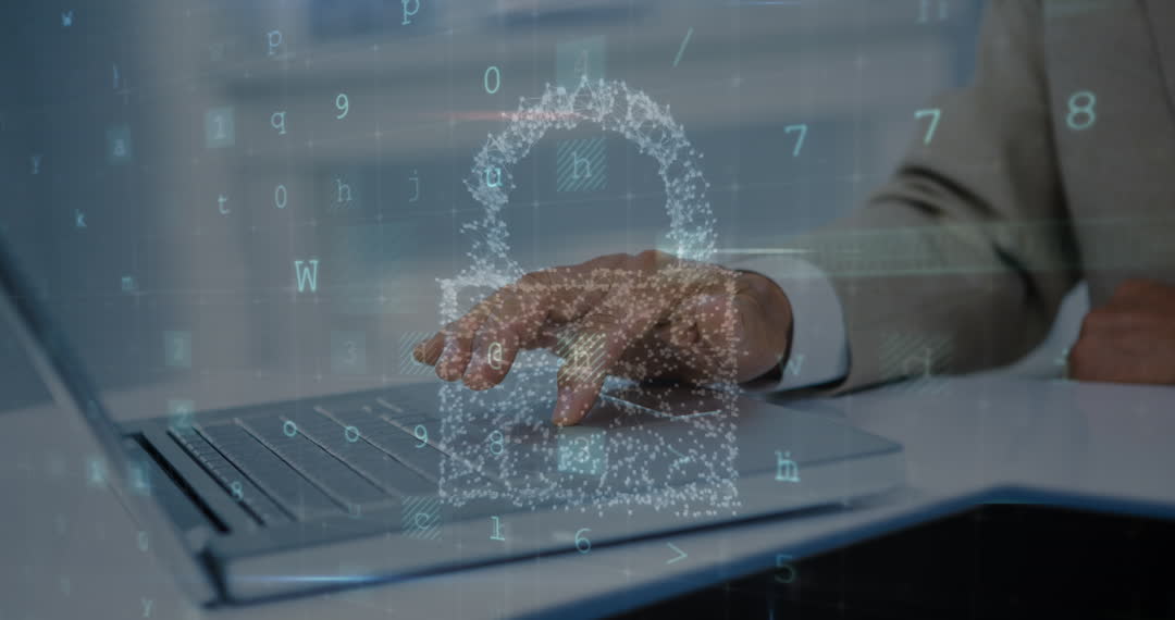 - Cybersecurity Concept with Digital Lock and Hand on Laptop