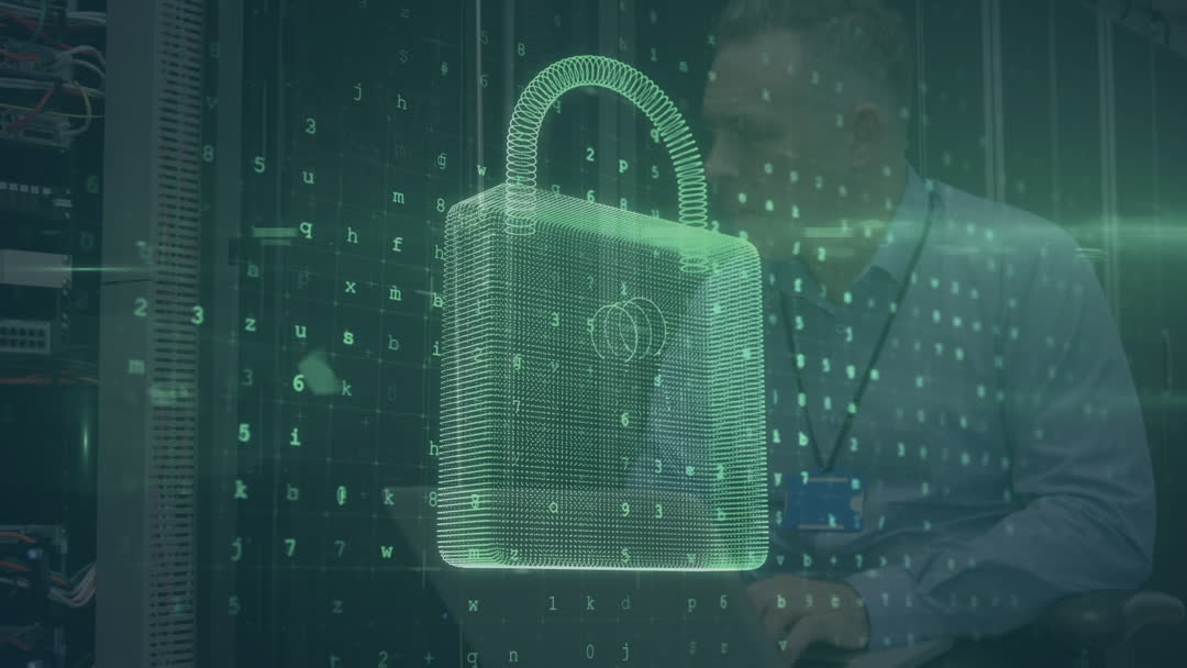 This digital composite presents the concept of cybersecurity, featuring an IT technician working beside servers, with an animation of a padlock symbolizing digital data protection overlay. This video is perfect for illustrating articles, blogs, or marketing materials focused on computer security, network safety, or discussing the importance of cyber defense in companies. It visually represents the complex nature of securing digital infrastructure and data in a connected world.