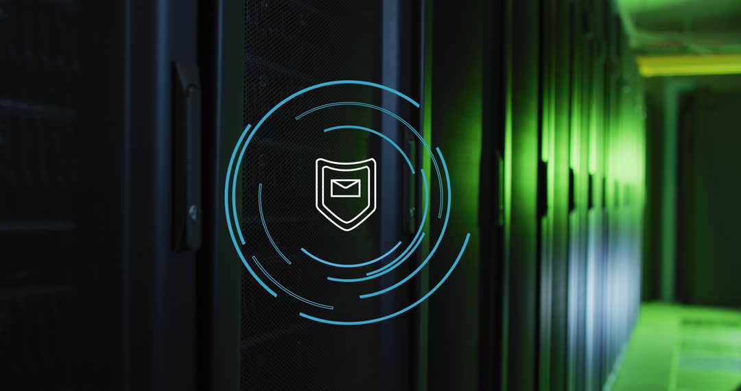 Visual featuring a futuristic shield with envelope icon overlaid on dimly lit server room, symbolizing secure email services and digital protection. Ideal for conveying themes of data safety and secure communication technologies, useful in presentations or articles related to cybersecurity solutions and IT infrastructure development.