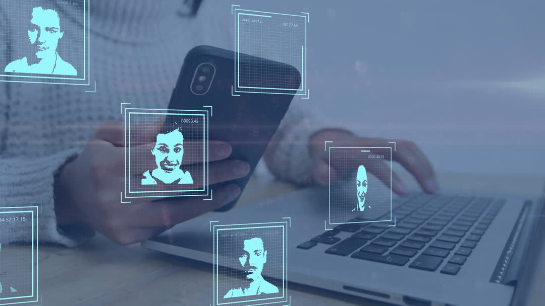 Representation of modern digital security involving multiple facial scans overlaid on a professional using technology devices. Useful for illustrating themes of online safety, data protection, or advanced identification technology.