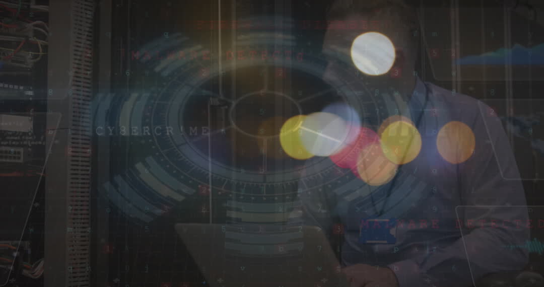Caucasian man checking server units blended with abstract blurred traffic lights and futuristic digital processing interfaces create a visually engaging representation of cybersecurity and data processing. Perfect for illustrating concepts related to network safety, IT security, and digital communications. Ideal for use in websites, presentations, corporate materials, or digital ads focusing on advanced technology and cyber protection solutions.