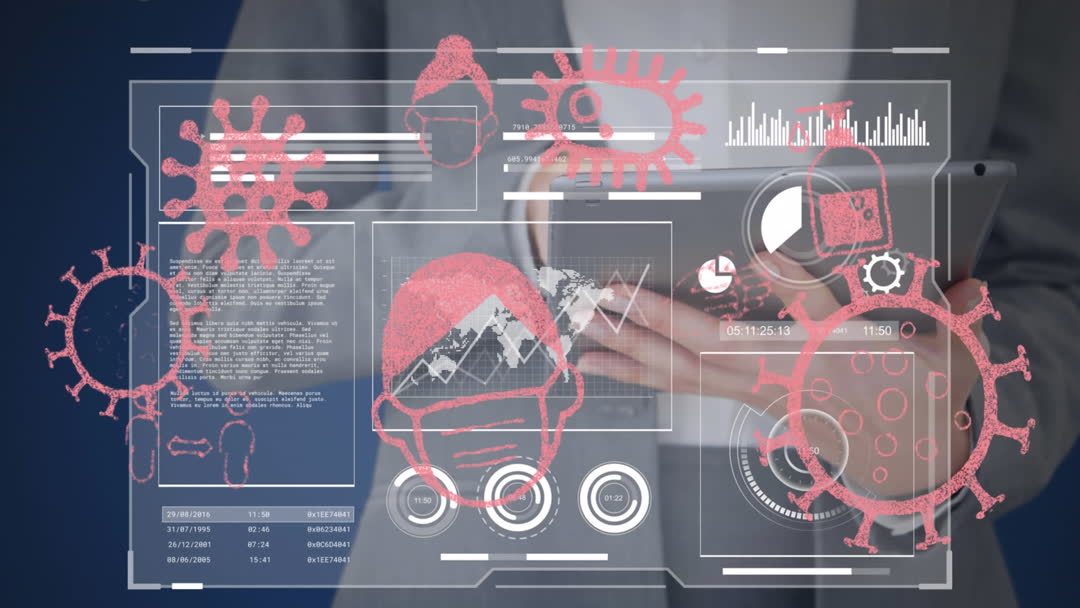 This conceptual design depicts a cybersecurity expert focusing on data analytics and viral statistics on a digital interface. It is ideal for use in articles, presentations, and educational materials related to information security, technology advancements, or data protection measures.