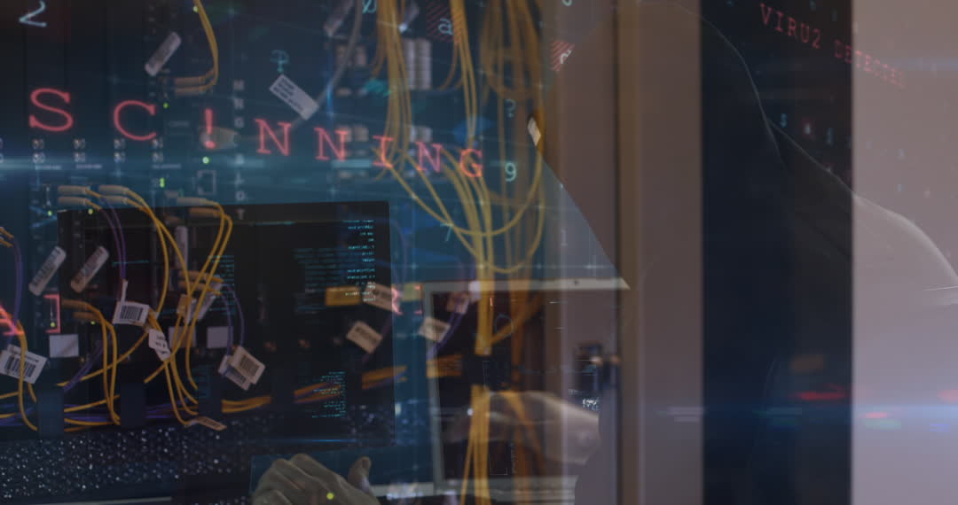 Cybersecurity expert monitoring data servers with digital interface graphics and cables visible. Ideal for illustrating information security processes, technological infrastructures, and professional IT environments.