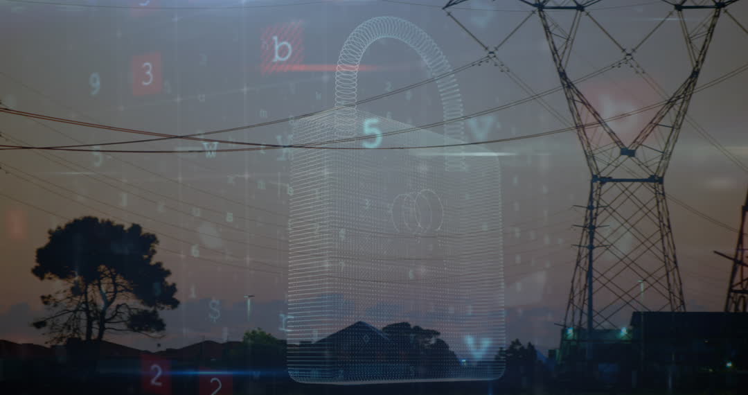 An abstract visualization shows a digital padlock overlaying electricity poles with an array of data symbols illustrating cybersecurity risks and data protection in the energy sector. Suitable for discussions on technology integration in utilities, challenges in energy data security, or electronic protection strategies in digital infrastructures.