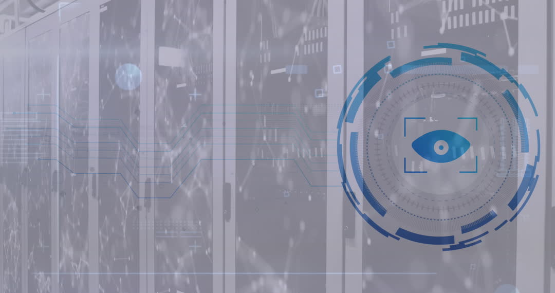 Cybersecurity Retinal Scan Overlaid Server Room Network Video