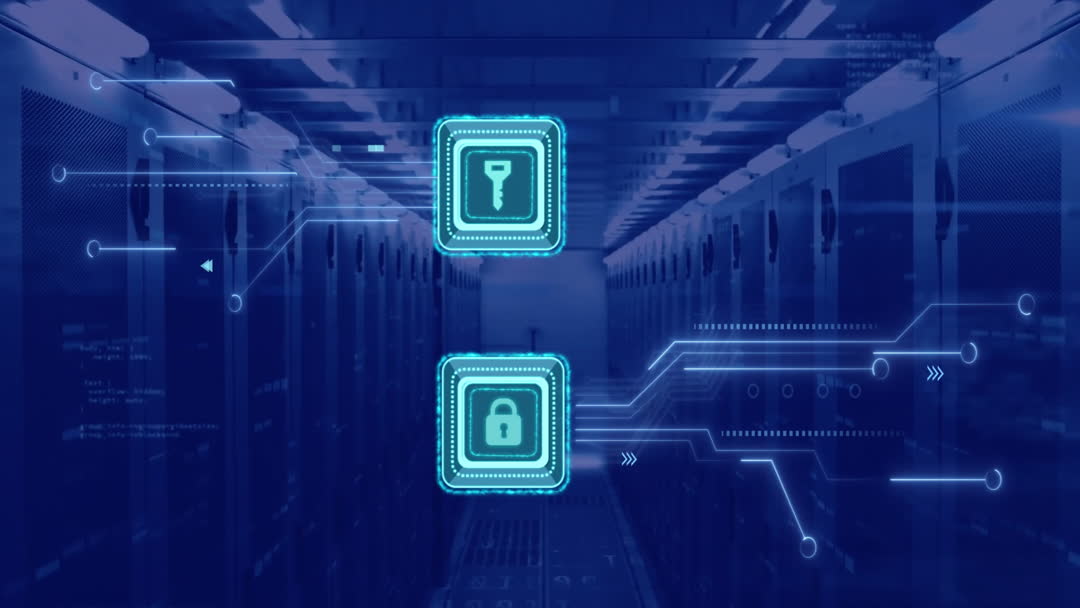 Animation showing digital data security elements like padlock and key symbols with graphics depicting circuits, integrated with server visuals. Suggests advanced technology in data protection and network security. Ideal for illustrating cyber threat topics, IT networks, or data encryption concepts in presentations, marketing for tech products or educational content about cybersecurity methods.