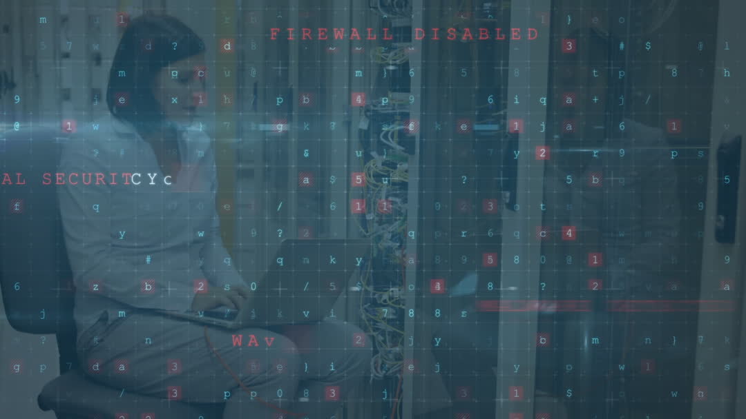 Caucasian female IT technician sitting with laptop in server room with overlay indicating data breach and virtual firewall disabled highlights invisible technology threats. Useful for concepts on cybersecurity emergencies, IT vulnerability, proactive security measures, and data theft prevention.