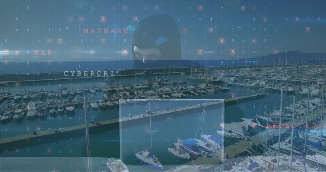 Conceptual video showcasing the risk of cybercrime where a virtual silhouette of a hacker with a laptop overlays a visual of a seaport. Digital codes and text excerpts emphasize technological vulnerability. Useful for articles on cybersecurity, safety measures in maritime industry, or illustrating digital threats in physical environments.