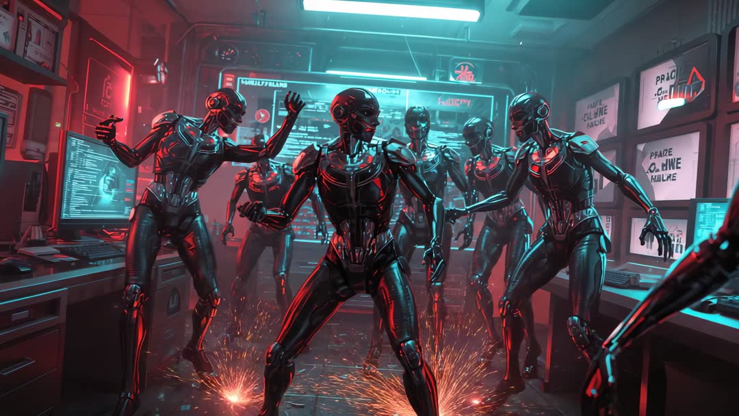 AI Generated Image. Six humanoid robots emerge in a high-tech control room, activating in a visually dynamic scene. These robotic figures showcase futuristic technology, each precision-engineered with complex machinery. Red sparks highlight the moment of activation in a cybernetic environment. The ambient lighting displays a blend of technical sophistication and advanced automation. Ideal for illustrating topics in AI, robotics engineering, or futuristic tech environments.