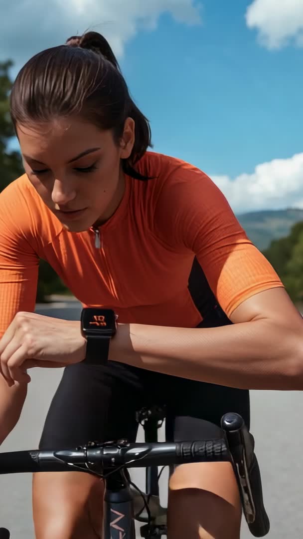 AI Generated Video. Showing female cyclist in orange short-sleeve jersey checking smartwatch while riding on open road with mountain backdrop. Close-up on wrist glance and handlebars emphasizing focus, speed, and wearable tech integration. Capturing natural daylight, vibrant orange and blue contrast, and dynamic forward motion. Ideal for fitness campaigns, smartwatch app demos, cycling training videos, sports apparel marketing, and lifestyle social media content. Working well for vertical mobile ads, Instagram Reels, TikTok stories, and product landing pages. Suggesting overlaying on-screen metrics, adding motivational voiceover, or including call-to-action for training plans. Offering cut-friendly footage for edits into longer workout sequences, app feature highlights, or promotional spots for endurance events.