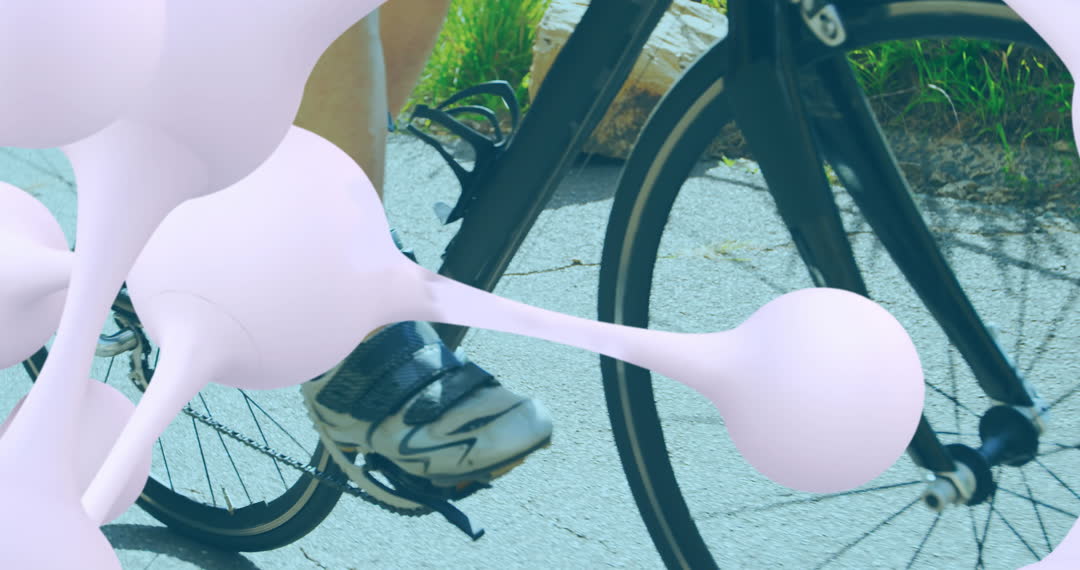 Cyclist pedaling on road blends physical movement with hint of molecular science, signifying holistic approach to fitness and well-being; suitable for articles on tech in sports, bridging human activity and science mixes.