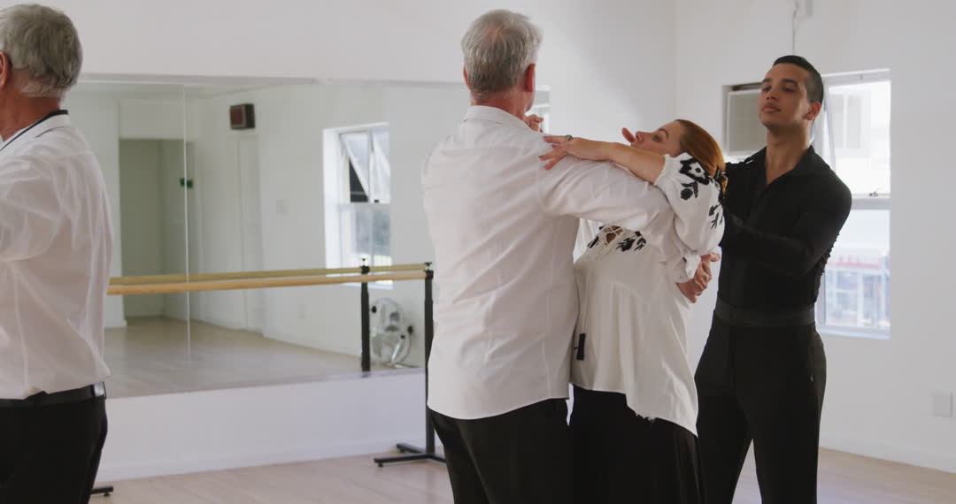 Dance instructor helps senior Caucasian couple with ballroom dance routine in studio. Useful for topics on active aging, dance education, senior fitness, and intergenerational activities. Perfect for promoting dance classes and community engagement in arts.