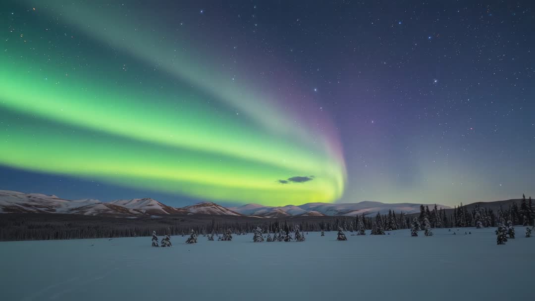 AI Generated Image. Single-frame video still showing vibrant green auroral curtain sweeping across star-filled night above snow-covered boreal plain and distant mountain ridges. Foreground featuring scattered snow-laden conifers and open frozen field, midground framing dark treeline, background revealing moonlit peaks with soft purple glow. Composition delivering strong horizontal flow and dramatic sky-to-land contrast, making clip ideal for wide-screen headers and cinematic sequences. Serving travel and adventure promos, powering nature documentaries, supporting climate and science segments, providing relaxation and meditation backgrounds, enhancing website hero loops, boosting social media reels and tourism campaigns, and enriching print and digital editorial spreads. Color palette offering neon green, pastel purple and deep indigo tones and allowing easy color matching and overlay of titles or lower thirds. Clip working well for slow pans, time-lapse edits, looped ambient backgrounds and stock footage libraries.