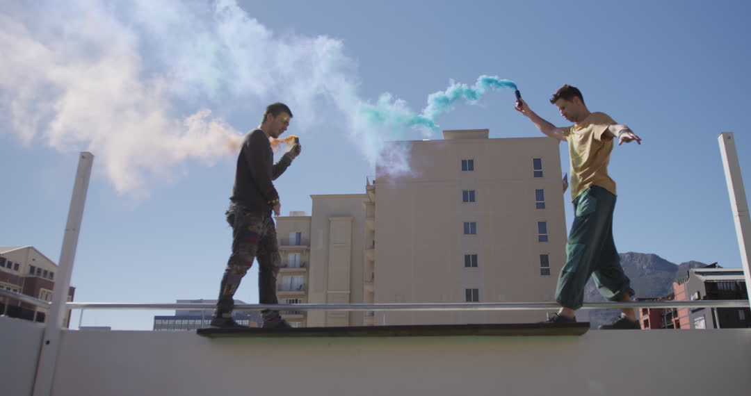 Two men navigate a rooftop edge holding bright flares against a cityscape backdrop. The vibrant colors of the flares contrast with the blue sky, capturing a moment of urban adventure. Suitable for themes of adrenaline-fueled sports, urban exploration, and youthful creativity.