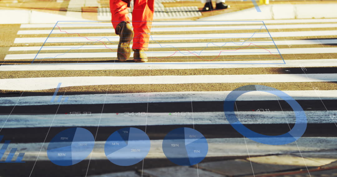 Abstract concepts of data analysis combine with real-world visuals, depicting a construction worker crossing a street with graph overlays. This video can illustrate themes of urban productivity, merging labour with digital technology. Useful for editorial content on business, data visualization, economic growth, or technology's impact on physical industries.