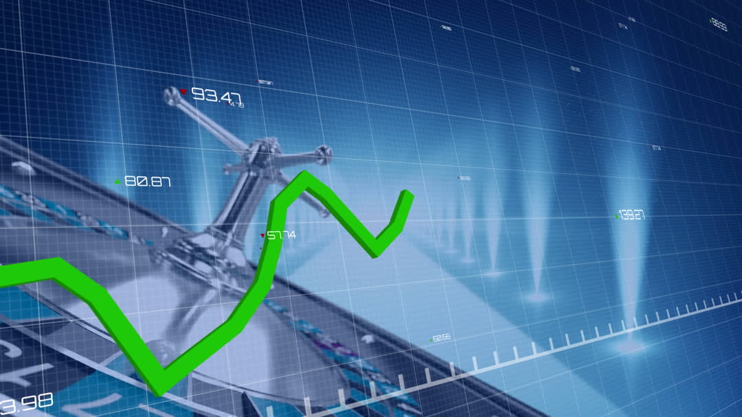 This visually engaging media illustrates digital data analysis with a central focus on a green line representing growth or progress intersecting with a wind turbine, symbolizing technology and sustainability. Ideal for presentations or articles related to economic trends, technology innovations, renewable energy, and global business strategies. The futuristic interface adds a modern and tech-savvy appeal.