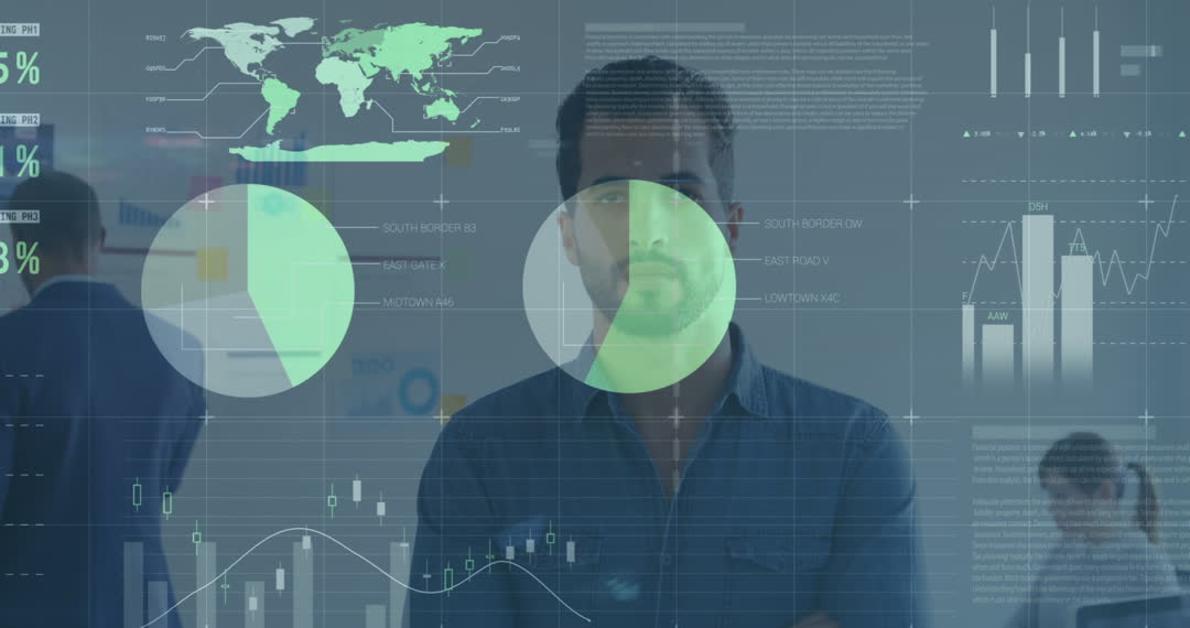 Young caucasian man in a modern office engages in business data analytics using a digital interface displaying graphical charts and global statistics. Useful for illustrating concepts in business technology, data science marketing, corporate workshops, and training materials.