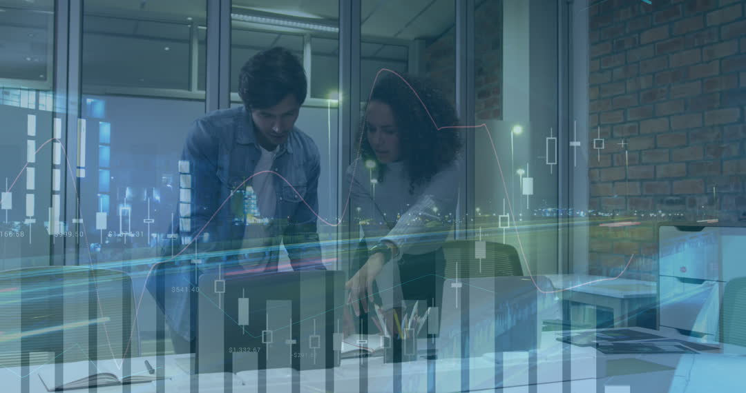 This visually intriguing scene captures two individuals analyzing financial data with digital charts and graphs overlaid on the video. Set in a modern office with an industrial vibe, the atmosphere suggests collaborative problem-solving and strategic planning. This video is versatile for themes related to finance, team dynamics, or technology integration in business. Ideal for illustrating articles or digital media content focused on market analysis, financial services, or office collaboration.