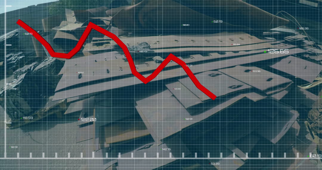 Abstract visualization of statistical data on a grid network appears over the backdrop of a scrap metal junkyard. This conceptual representation combines global business implications with recycling themes, suitable for content related to environmental economics, industrial recycling, and data-driven business strategies. Ideal for illustrating reports, presentations, and articles on sustainable business practices and market analysis.