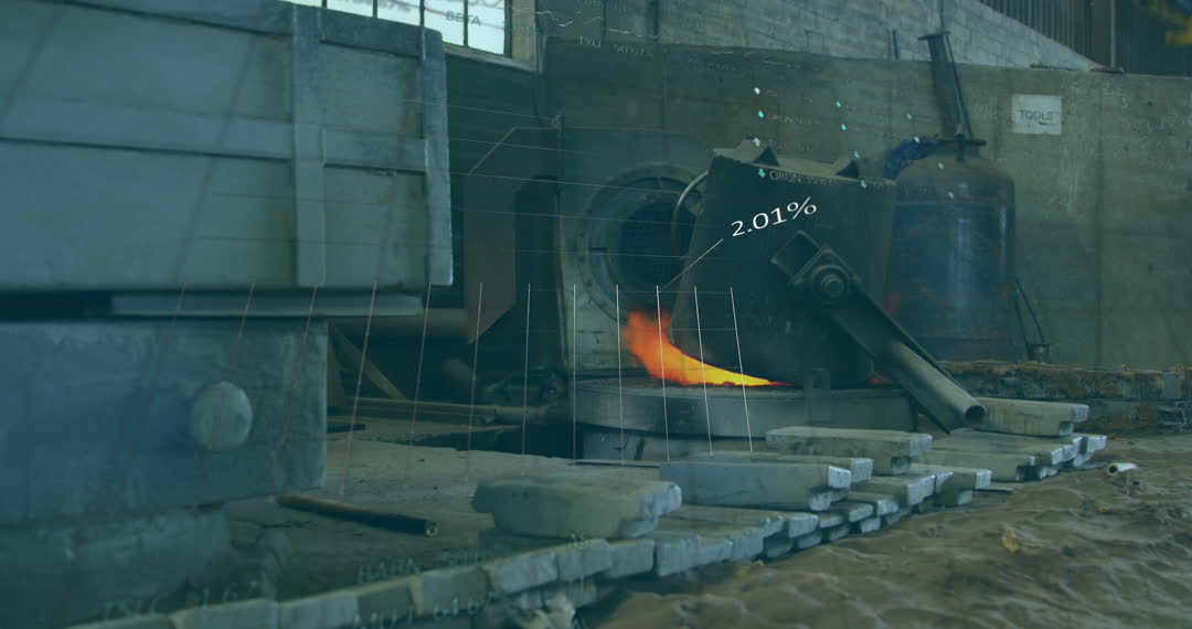 Shows industrial furnace with data analysis graphics overlay, representing integration of technology in manufacturing for performance monitoring and development. Ideal for illustrating concepts related to industrial innovation, data-driven processes, and smart factories in presentations or media materials.