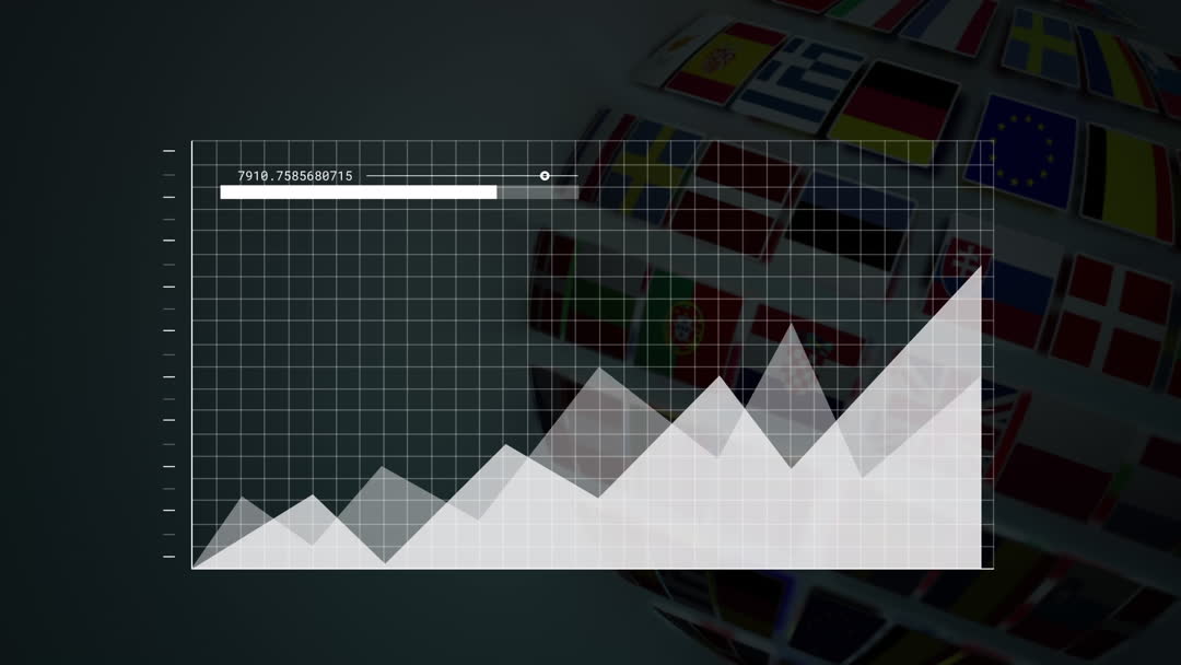 Stylized representation of a graphical chart over multilayered international flag patterns, illustrating global financial dynamics and growing profit trends. Suitable for use in articles, presentations, or advertisements related to data visualization and international economics.