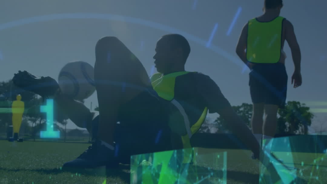 Athletes engage in soccer along with visuals of data and analytics, symbolizing the intersection of sports and technology. This can be used for illustrating articles or content related to sports technology, digital transformations in athletics, or data usage in sports strategies.