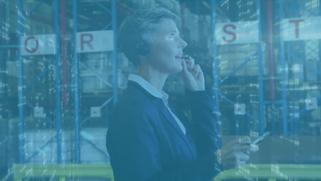 Business professional using headset and digital tablet in a warehouse filled with data-transcending visuals, symbolizing data management and global connectivity in the logistics sector. Ideal for illustrating modern communication methods in inventory management or showcasing innovative practices in supply chain industries.