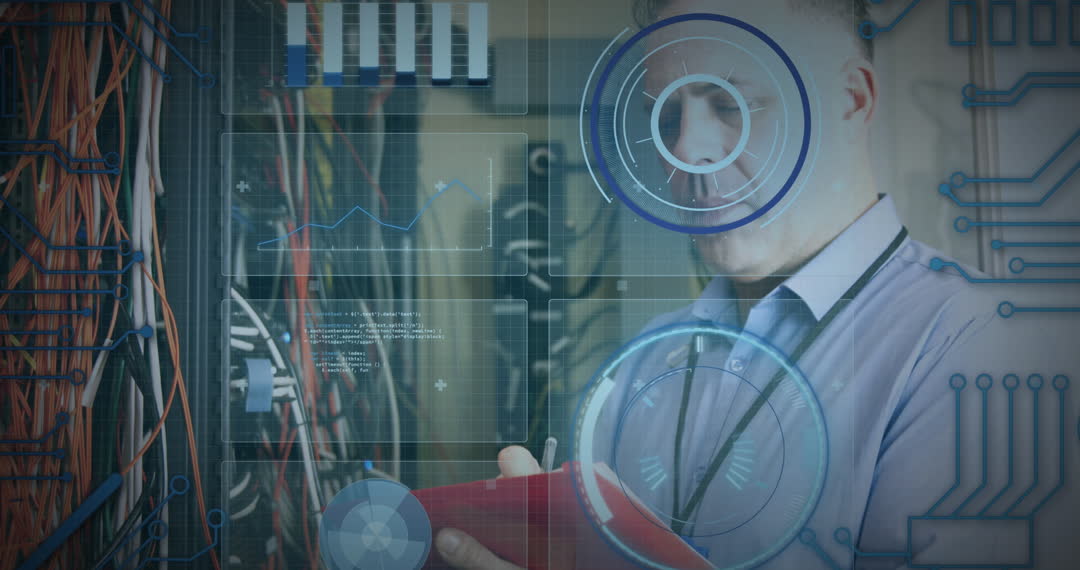 Scene shows man interacting with digital interface overlaid on server room background. Concept for data processing, technological advancements, and global business analytics. Suitable for illustrating future tech, analytical processes, or conveying modern reliance on data in industries.
